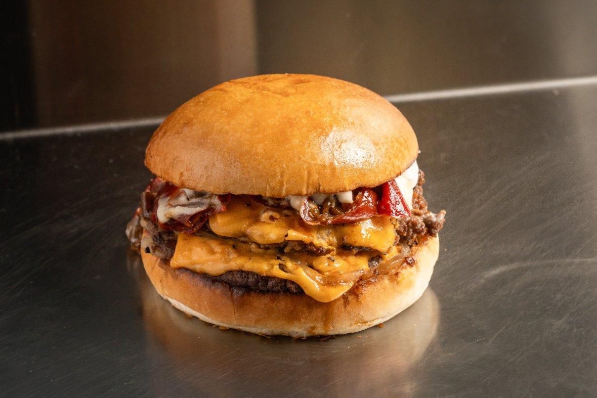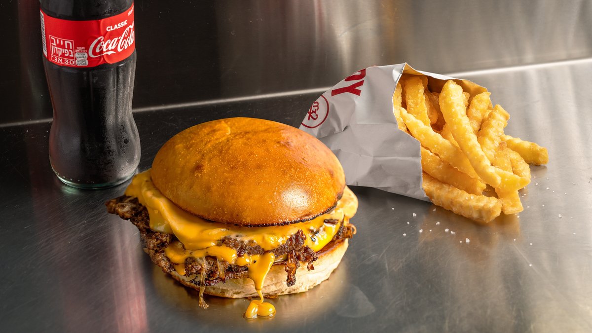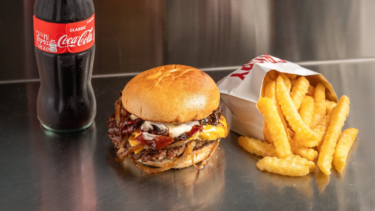 2 קציצות סמאש צרובות בלחמנייה רכה, ריבת צ'ילי, בצל חרוך, צ'דר כפול ואיולי שום פרמזן (110 גרם ליח׳ קציצה) * לא ניתן לבצע שינויים ברמת החריפות *