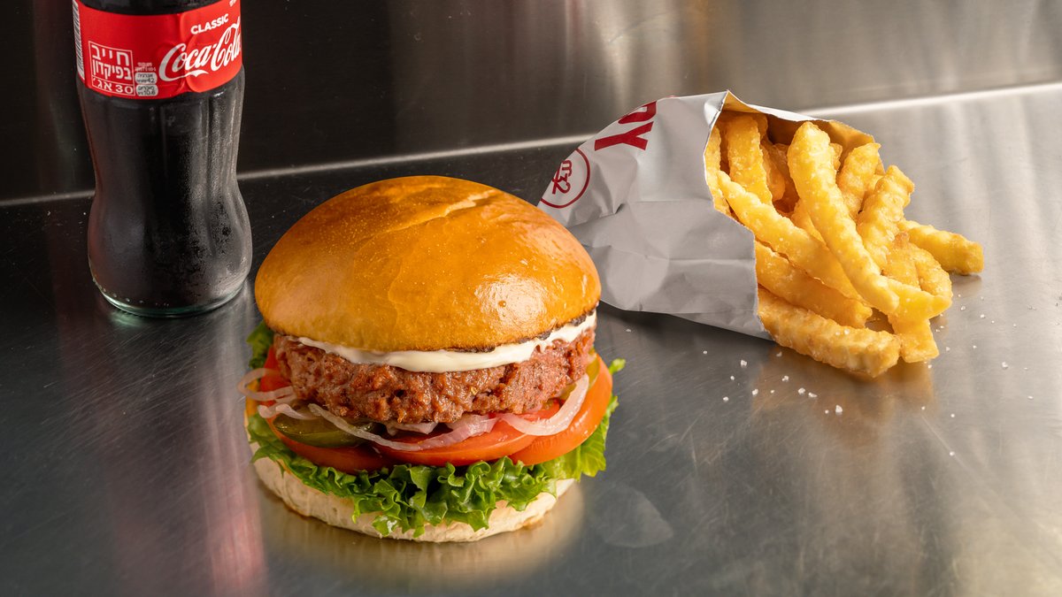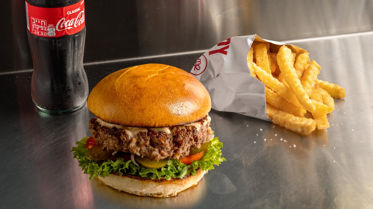 המבורגר 110 גרם מבשר בקר טרי בלחמנייה רכה, רוטב הבית, חסה לאליק, בצל כבוש, עגבנייה וחמוצים *ניתן להוריד כל אחד מהירקות