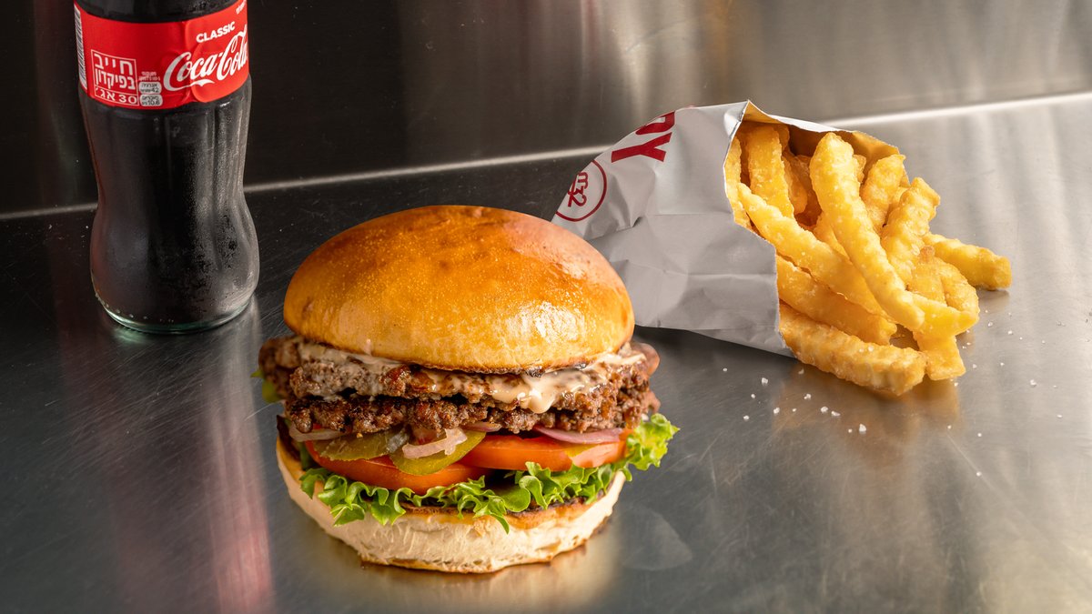 2 קציצות סמאש צרובות בלחמנייה רכה, רוטב הבית, חסה לאליק, בצל כבוש, עגבנייה וחמוצים | 110 גרם ליח׳ קציצה