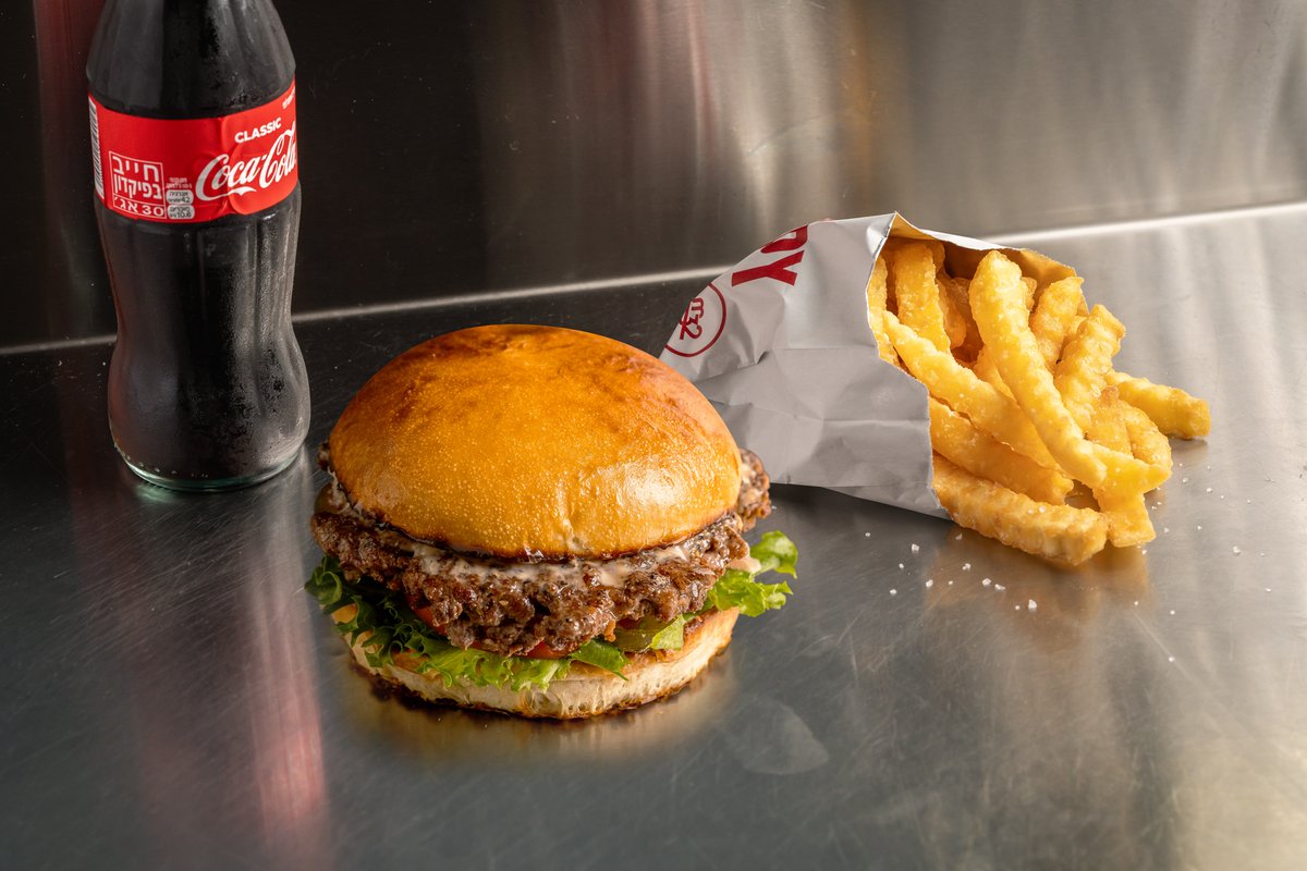 בורגר 110 גרם מבשר בקר טרי בלחמנייה רכה, רוטב הבית, חסה לאליק, בצל כבוש, עגבנייה וחמוצים *ניתן להוריד כל אחד מהירקות