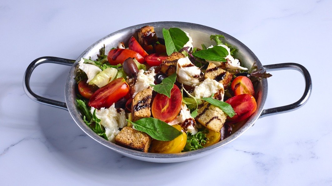 לקט חסות, מיקס שרי, בצל סגול, קרוטונים, זיתי קלמטה, בייבי מוצרלה וחומץ בלסמי