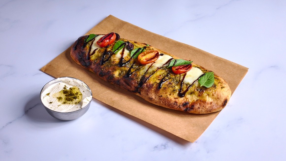 איולי שום, עשבי תיבול, גבינה בולגרית, בצל סגול, זיתי קלמטה, מוצרלה וזעתר, מוגש עם סלט צד