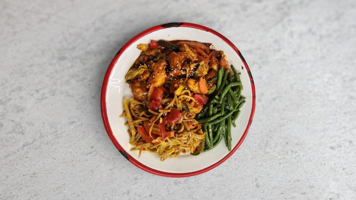 קציצות עוף טחון עם ירק ברוטב הבית, מוגש עם תוספת לבחירה