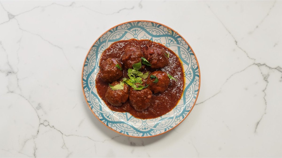 קציצות בקר ברוטב עגבניות מפנק, מוגש עם תוספת לבחירה