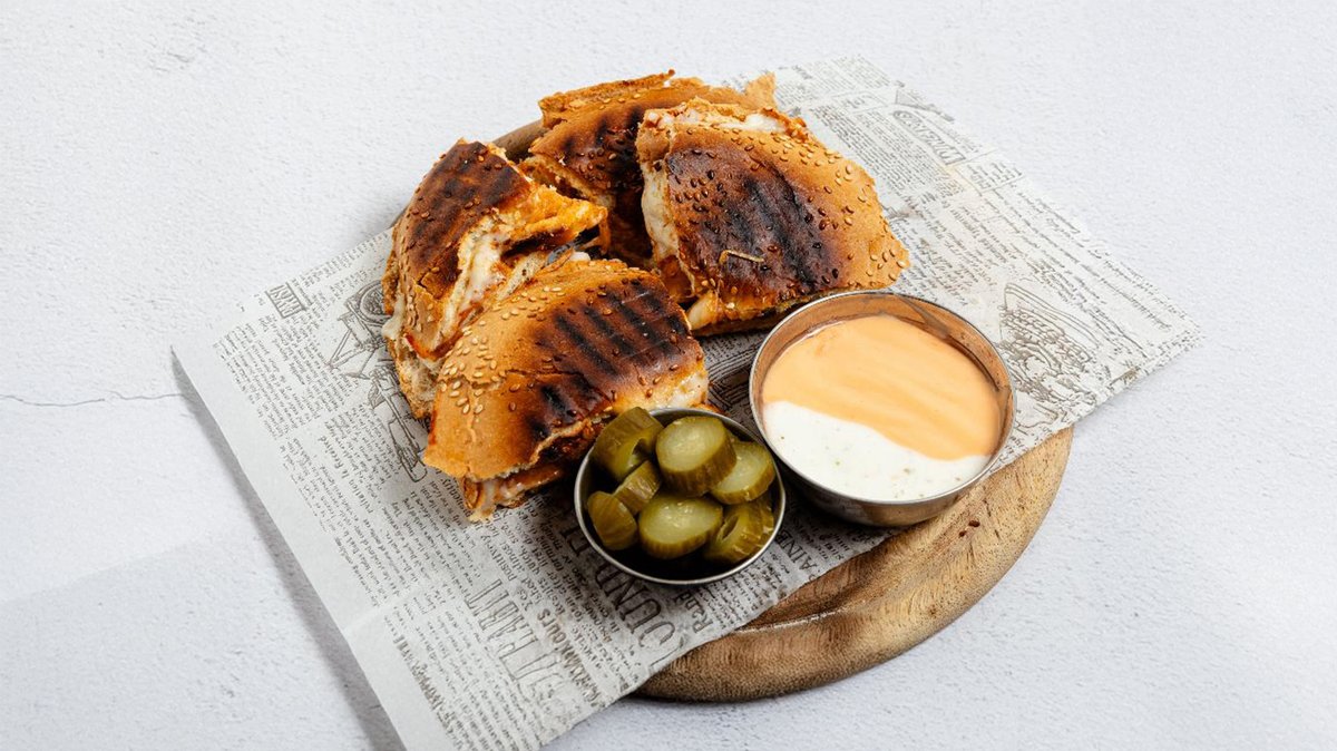 טוסט עם רוטב פיצה, גבינת הבית ותוספות לבחירה מוגש לצד רוטב שום ואלף האיים בצד