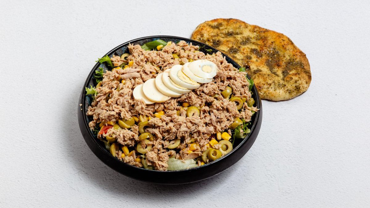 חסה, עגבנייה, מלפפון, בצל לבן, זיתים, תירס, טונה וביצה קשה