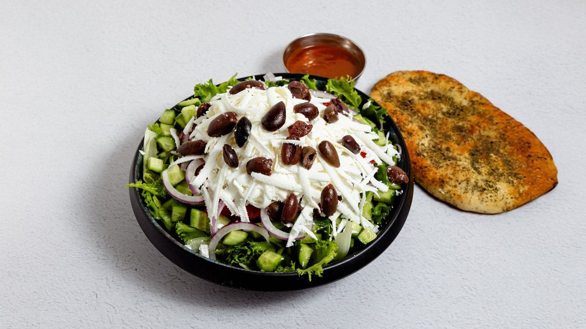 חסה, עגבנייה, מלפפון, גמבה, זיתי קלמטה, בצל סגול ובולגרית