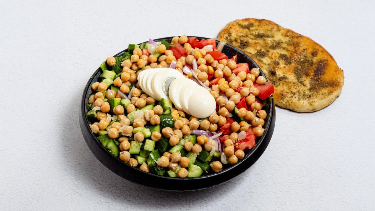 חסה, עגבנייה, מלפפון, בצל סגול, גרגרי חומוס, טחינה וביצה קשה