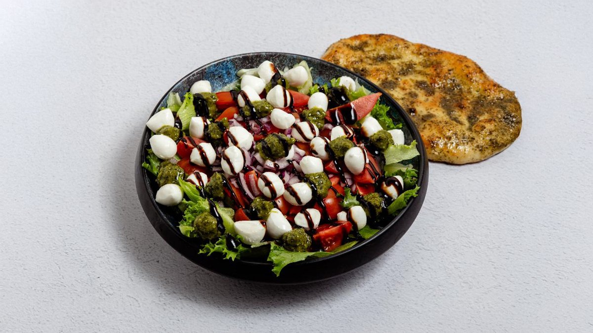 חסה, שרי, בצל סגול, בייבי מוצרלה, בלסמי מצומצם ופסטו
