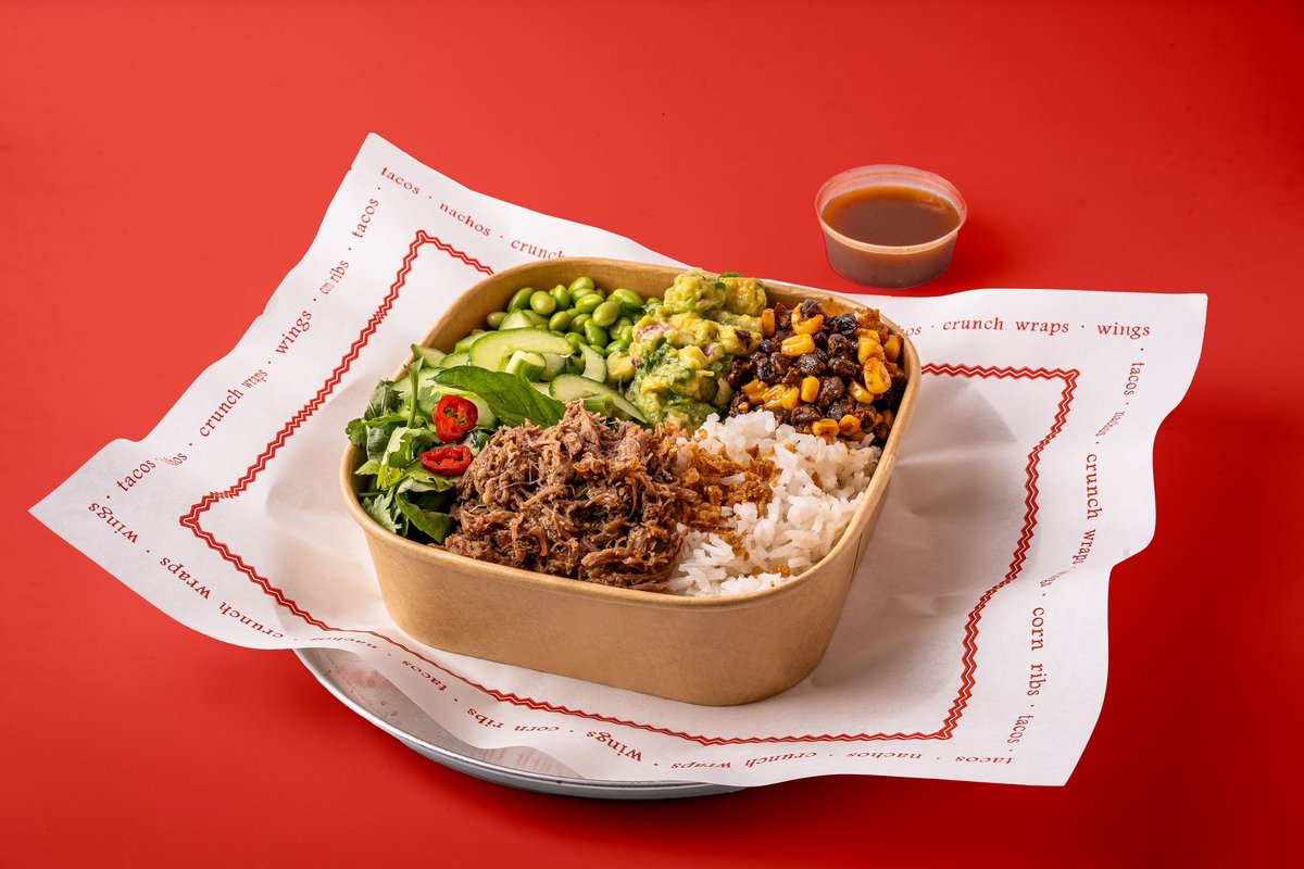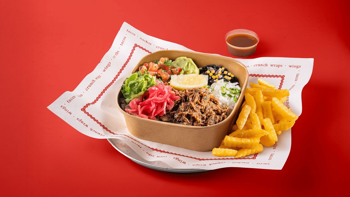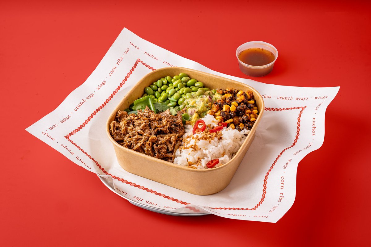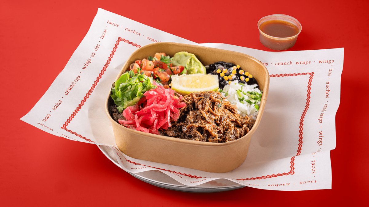 קערת רפידוס מפורק עם אורז, שעועית שחורה ותירס, קוביות אבוקדו, סלסת עגבניות, בצל מוחמץ וחסה. מוגש עם תוספת צד וציר בירייה.