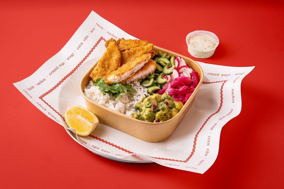 קריספי דג,אורז, קוביות אבוקדו, מלפפון, בצל מוחמץ, צנונית, כוסברה. מוגש עם איולי לימון ותוספת צד לבחירה