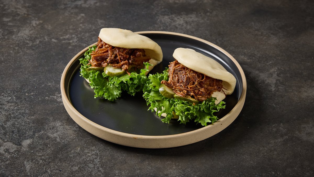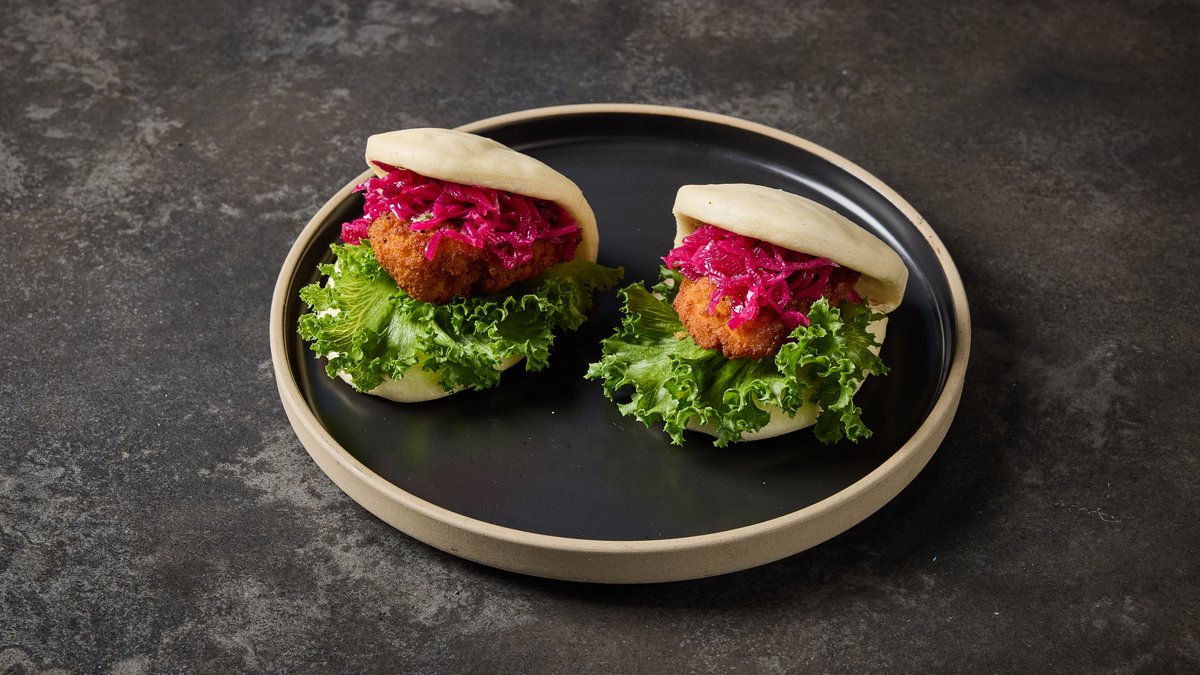 לחמניית באן, חסה לליק, קריספי צ׳יקן, כרוב סגול ואיולי פסטו