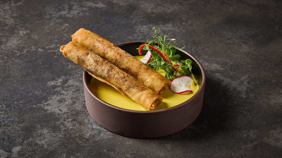 דף אורז רשת במילוי עוף, גזר, שיטאקה על מצע של אייסברג, נענע, כוסברה ורוטב פונזו 4 יחידות