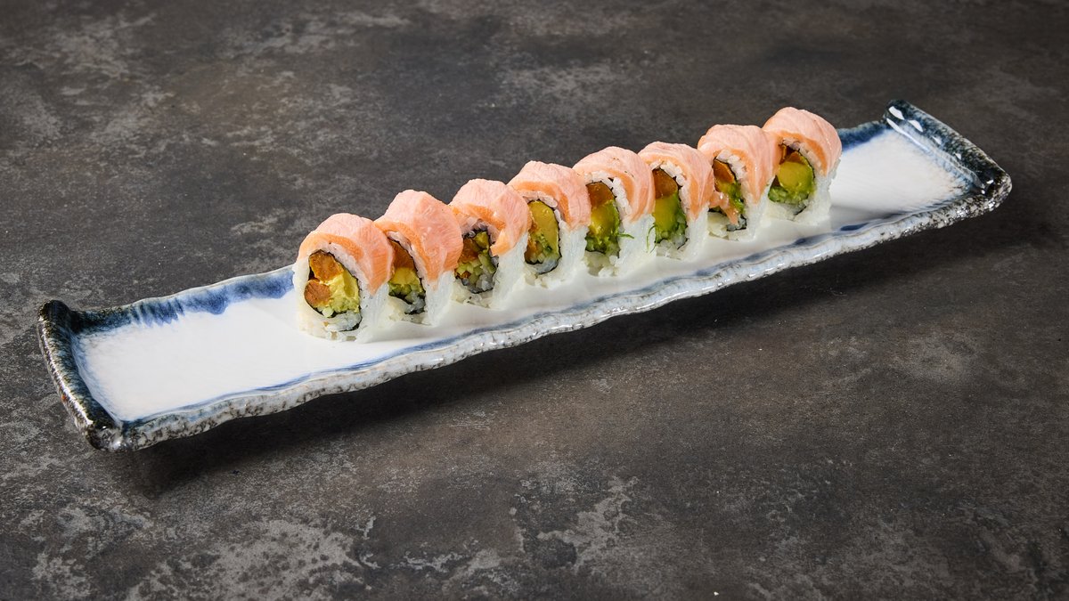רול עם אבוקדו, עטוף בסלמון ועירית קצוצה