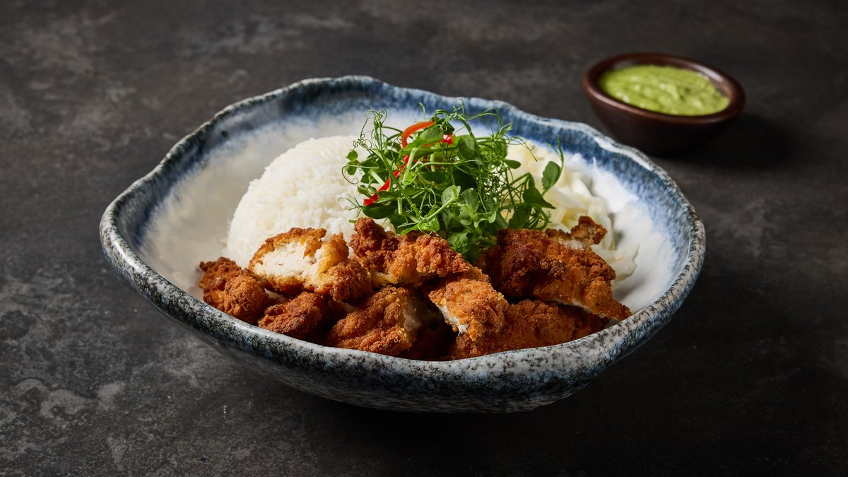 חזה עוף טרי בציפוי פנקו. מוגש עם צ'יפס / אורז לבן