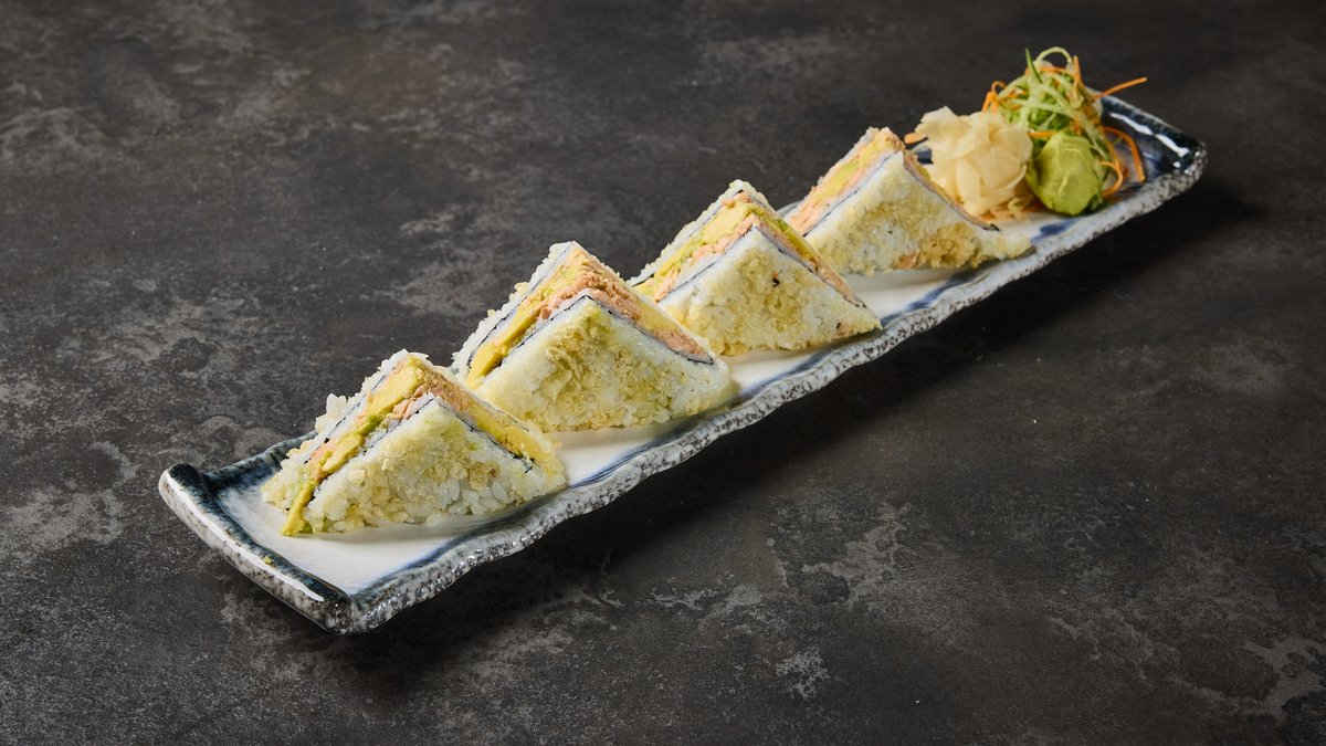 טונה, סלמון, מלפפון, עירית, אבוקדו, עטוף בשבבי טמפורה