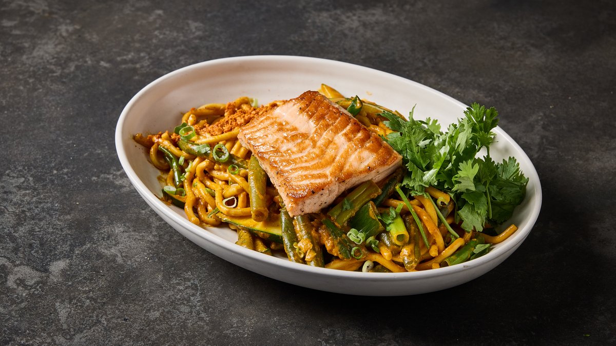 אטריות חיטה, קרם קוקס, קארי צהוב, בצל ירוק, כוסברה, זוקיני, שעועית ירוקה, בוטנים, סלמון