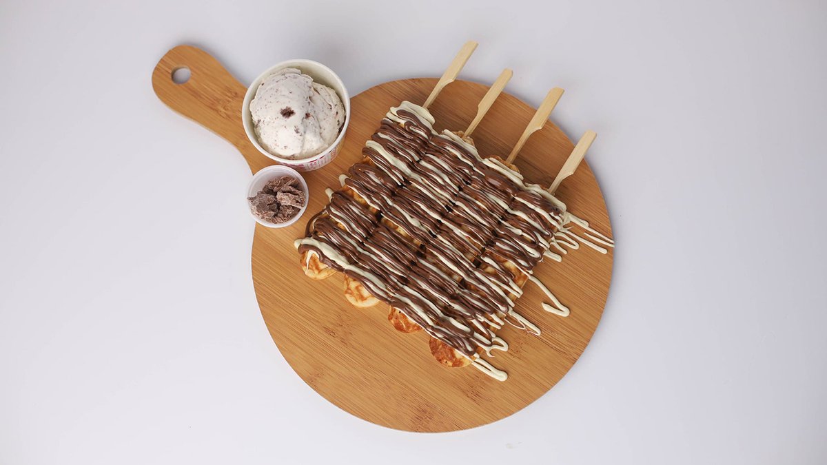 3 מקלות וופל בלגי עם נוטלה ושוקולד לבן מוגש עם גלידה ותוספות לבחירה