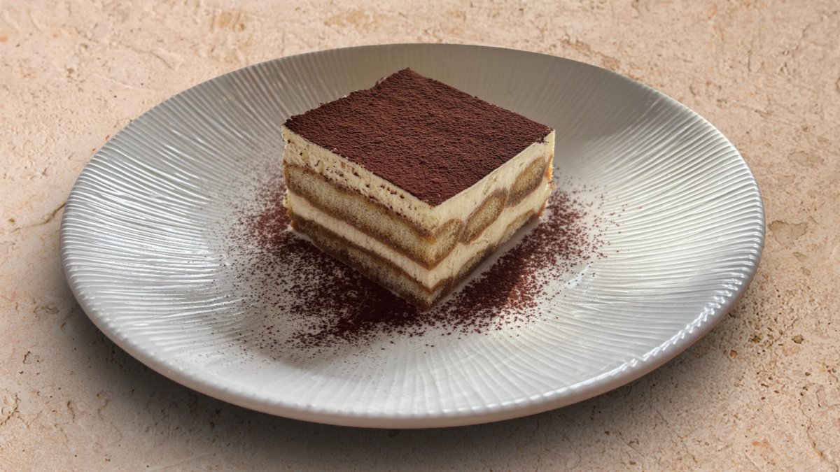 שכבות של בישקוטים ספוגים באספרסו, קרם גבינת מסקרפונה וקפה, בעיטור קקאו
