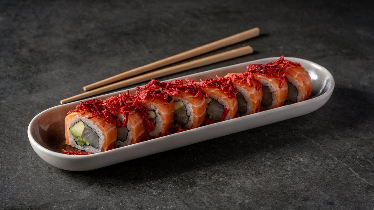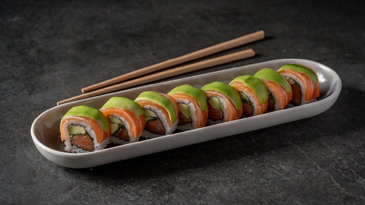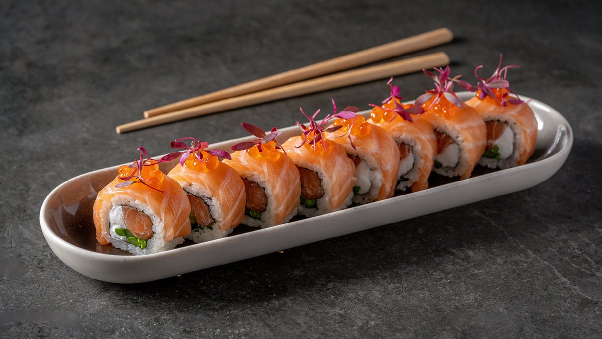 סלמון, מלפפון, ספייסי מיונז, עירית ואבוקדו, עטופים בסלמון צרוב, שבבי בצל ואיולי יוזו