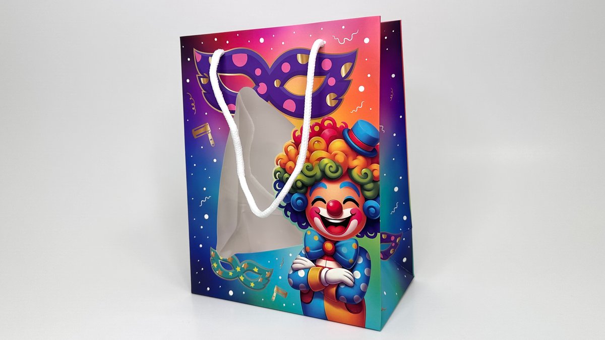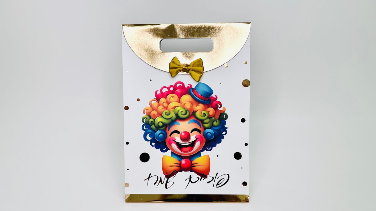 שקית קרטון בינונית פורים שמח עם דמות ליצן + ידית | יחידה אחת
