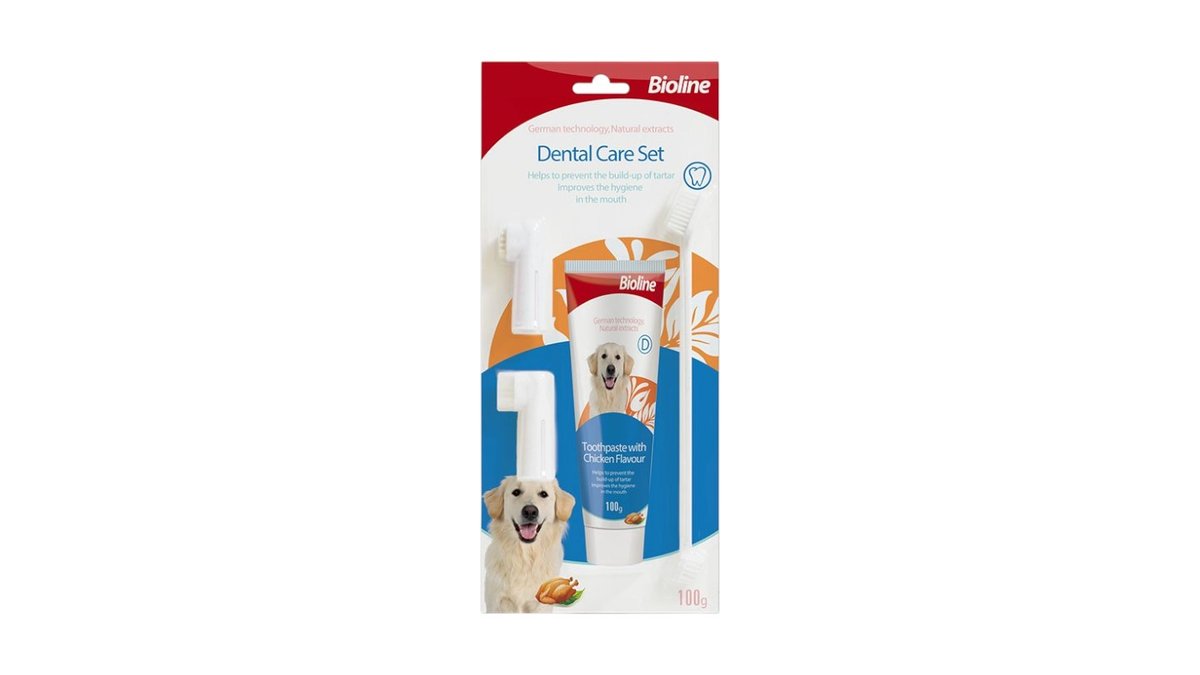 ביוליין Bioline ערכה דנטלית לכלב עם מברשות ומשחת שיניים בטעם עוף