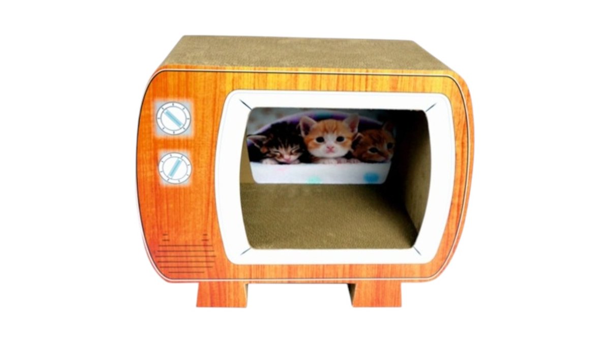 קרטון גירוד לחתול בצורת טלוויזיה עם פתח מסתור