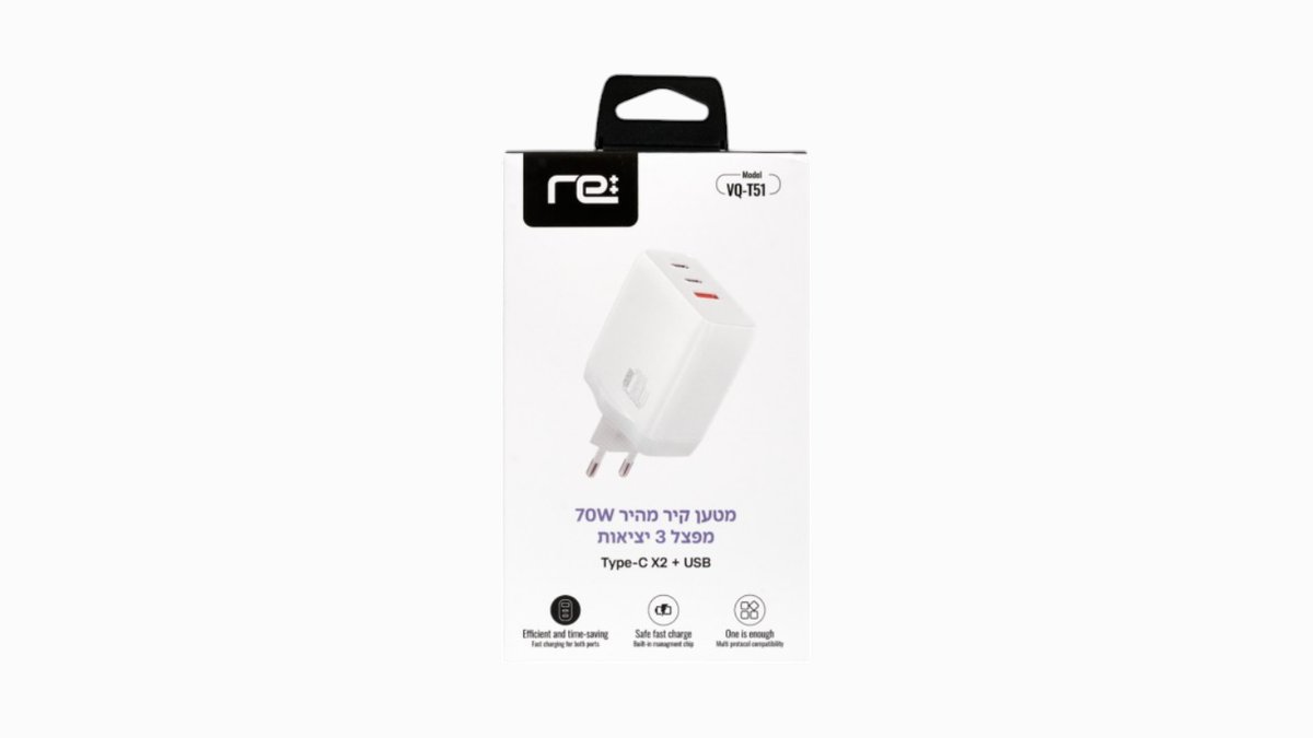 RE מטען קיר מהיר 70W עם 3 יציאות - Type-C x 2 + USB0
