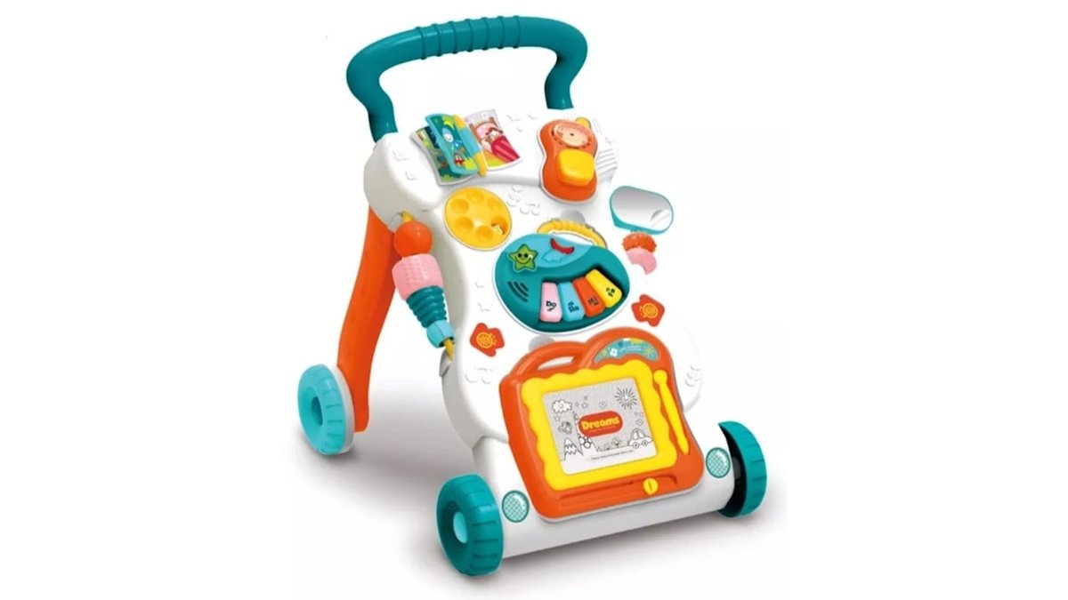 הליכון מנגן לתינוק עם גלגלי סיליקון מונעי החלקה, לוח ציור ופסנתר מנגן ומאיר - ורוד