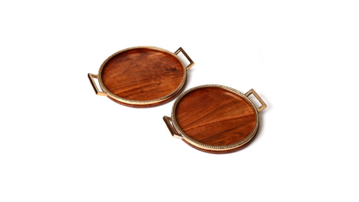 זוג מגשי עץ עגולים עם מסגרת וידיות זהב