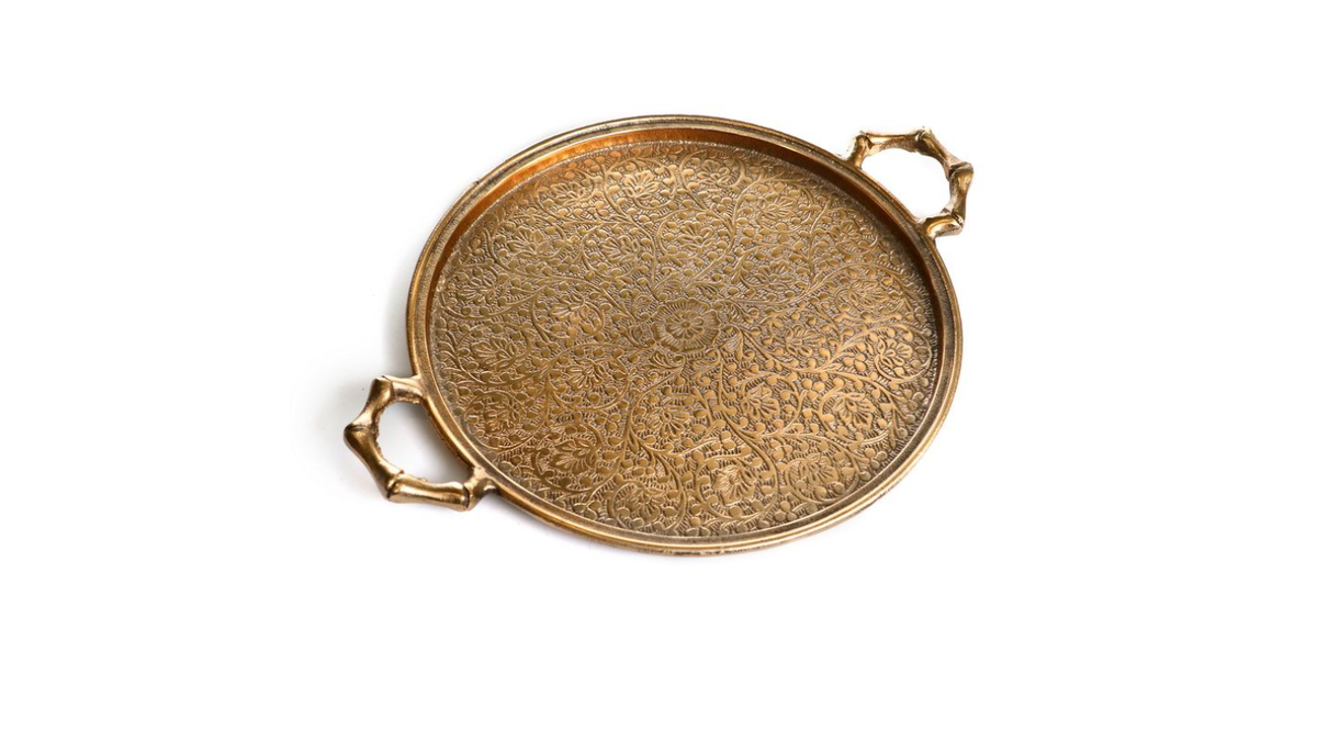 מגש מתכת עגול בציפוי זהב עם ידיות