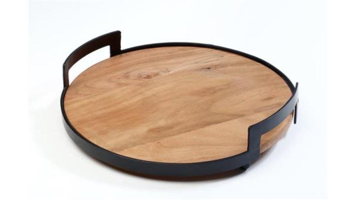 מגש עגול מעץ מלא עם ידיות מתכת | קטן