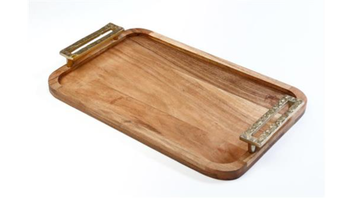 מגש עץ מלא עם ידיות זהב מט | גדול