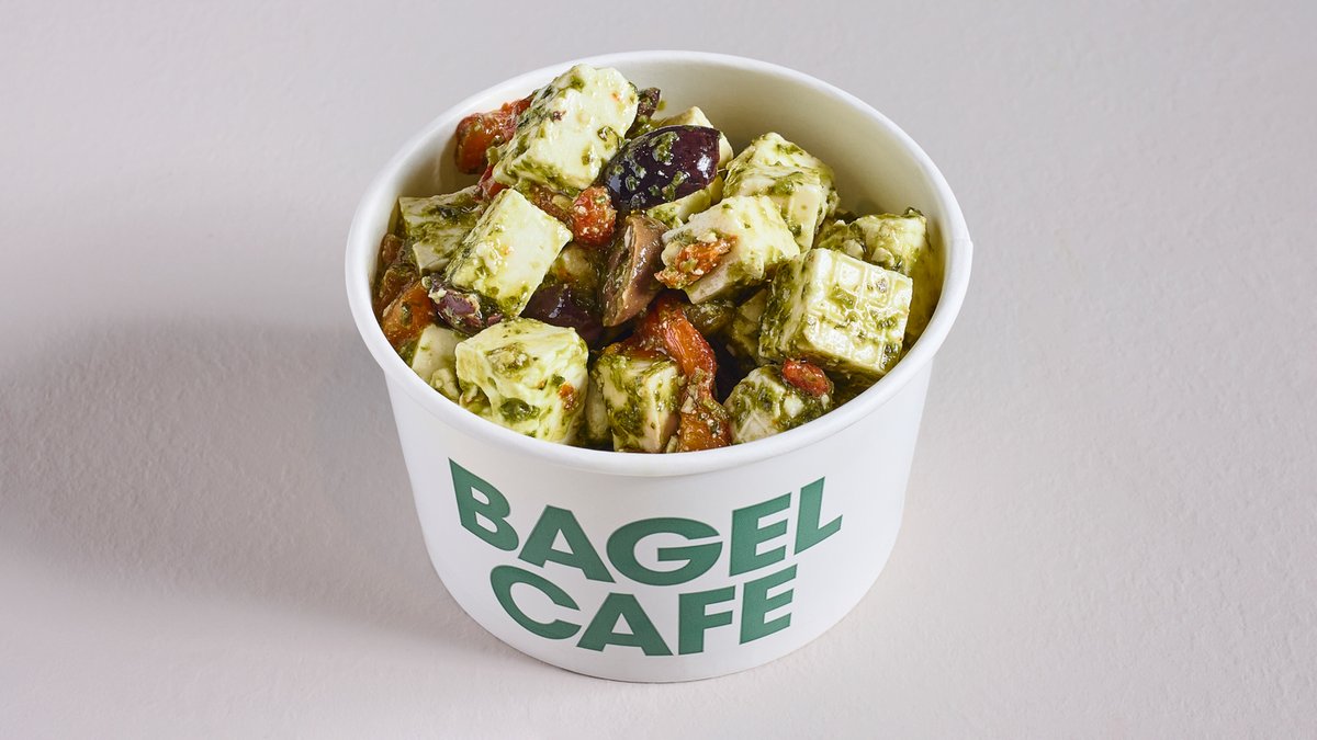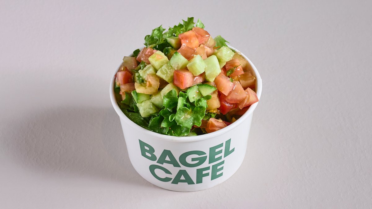 עגבניות שרי, מלפפון, חסה, בצל סגול, פלפלים, זיתי קלמטה, גבינה בולגרית, פסטו, זעתר, רוטב שמן זית לימון | מוגש עם בייגל לבחירה