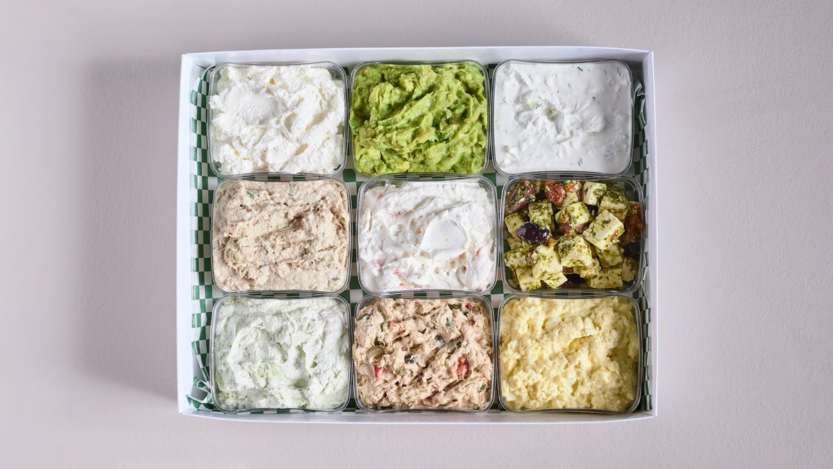6 בייגל, 4 סוגים של ממרחים / סלטים לבחירה, ירקות חתוכים וירקות אפויים