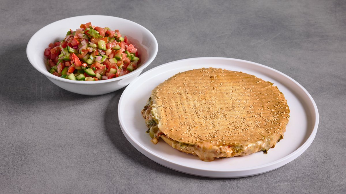רוטב פיצה, פסטו, גבינה בולגרית, גבינה צהובה וזיתים, מוגש בבייגל שומשום