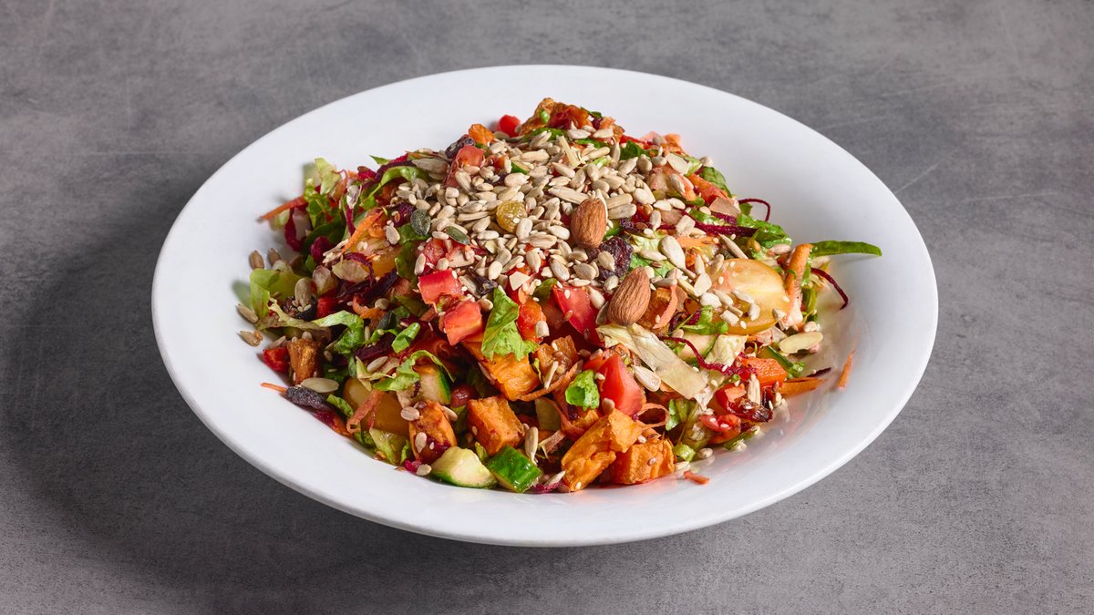 חסה, עגבנייה, מלפפון, קוביות בטטה, רצועות סלק, רצועות גזר, פלפל קלוי ובצל וסגול
