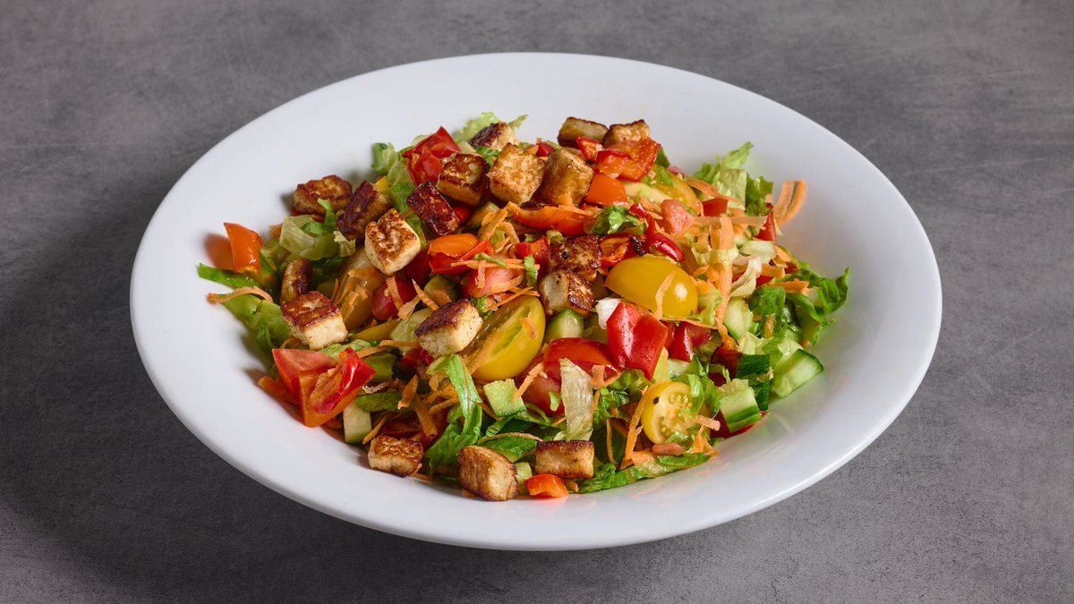 קוביות חלומי צרובות, חסה, עגבנייה, מלפפון, גזר ופלפל קלוי