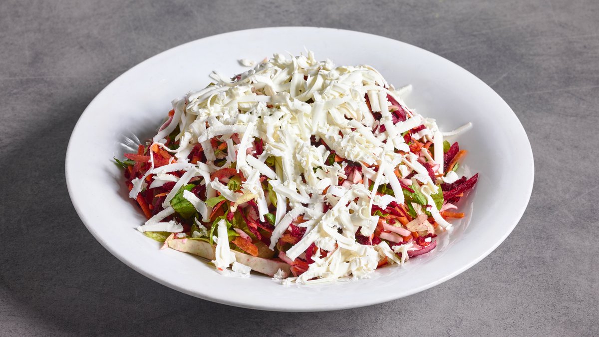 גבינה בולגרית, רצועות סלק חי, רצועות גזר, כרוב לבן, בצל סגול, חסה ופטרוזיליה