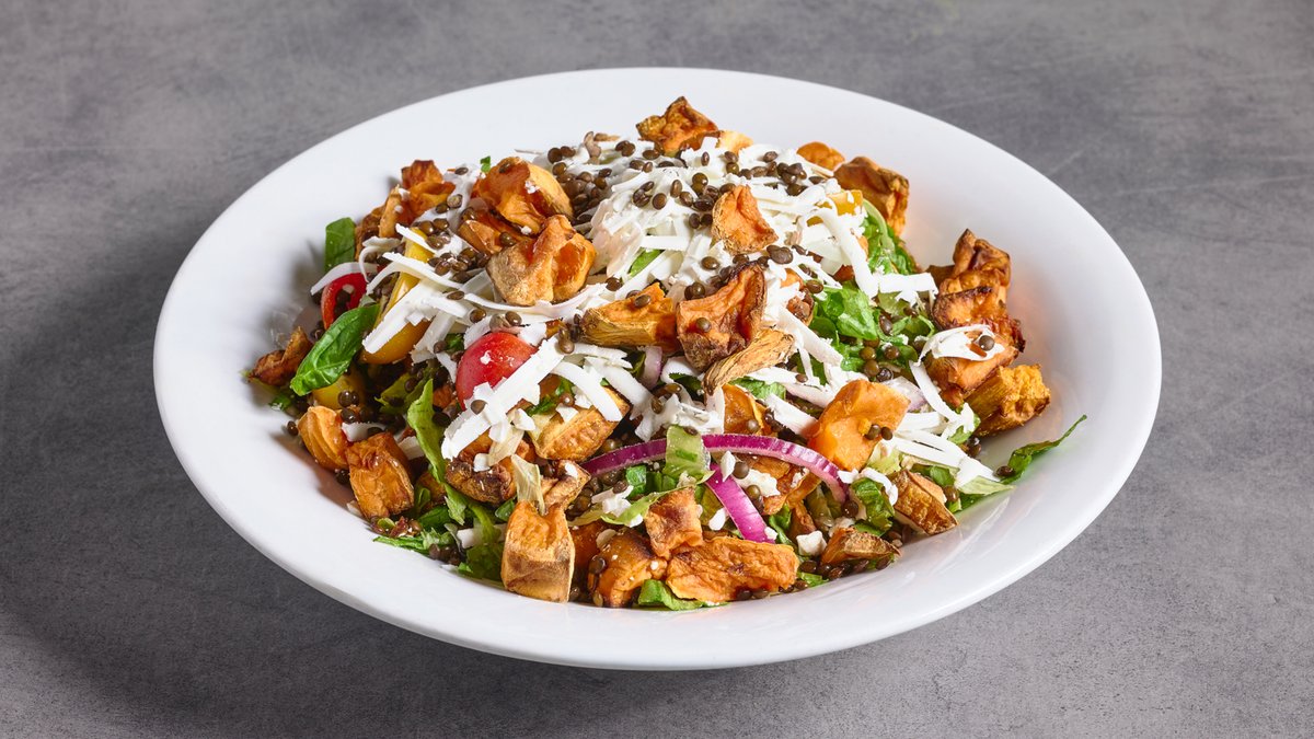 קוביות בטטה אפויה, עדשים שחורות, חסה, עגבנייה וגבינה ובולגרית