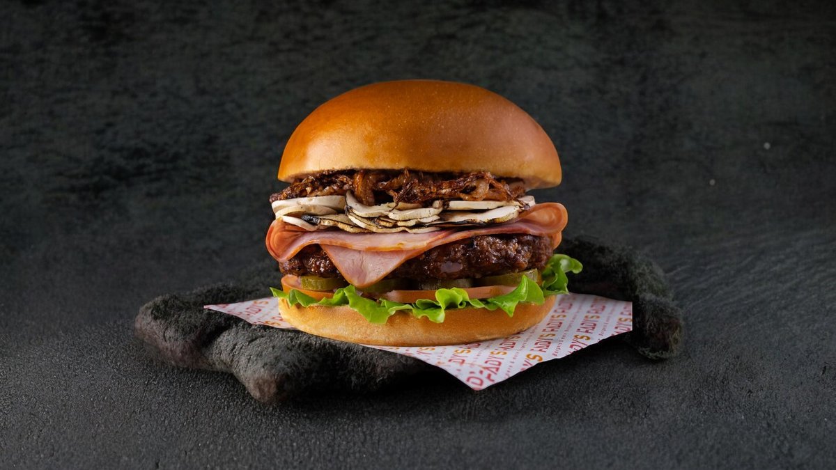 בורגר בקר כ200 גרם, חזה אווז, בצל מטוגן, פטריות צלויות, גבינת צ׳דר, חסה, עגבניה וחמוצים בלחמניית המבורגר