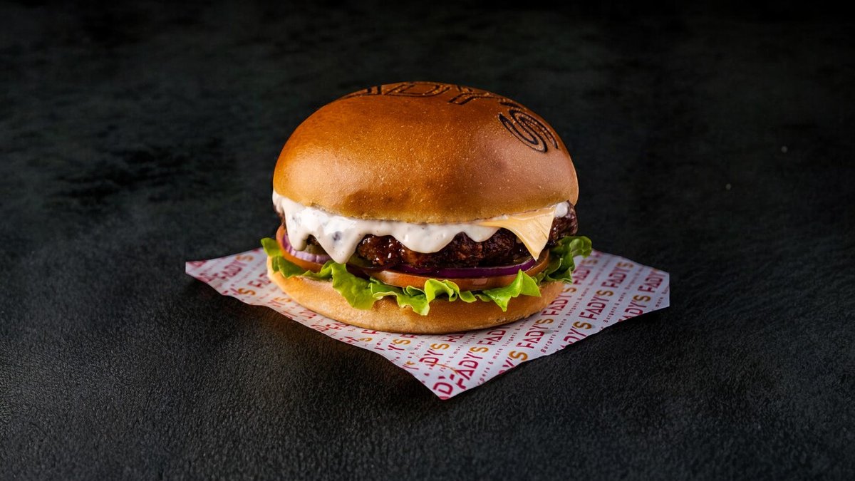 בורגר בקר כ150 גרם צלוי בגריל, גבינת צ׳דר, חסה, עגבניה, חמוצים ובצל סגול בלחמניית המבורגר
