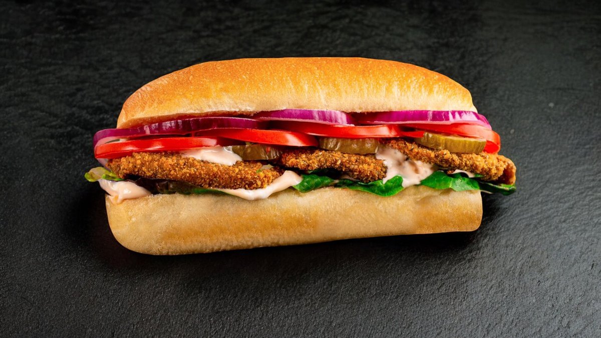 שניצל חזה עוף כ180 גרם, חסה, עגבניה, בצל סגול וחמוצים בלחמניית המבורגר