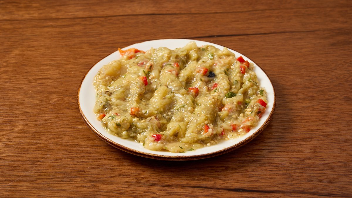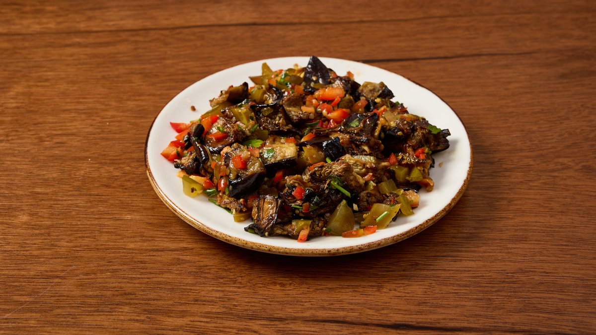 קוביות חציל עם שום, שמן זית גלילי, פטרוזיליה ופלפל