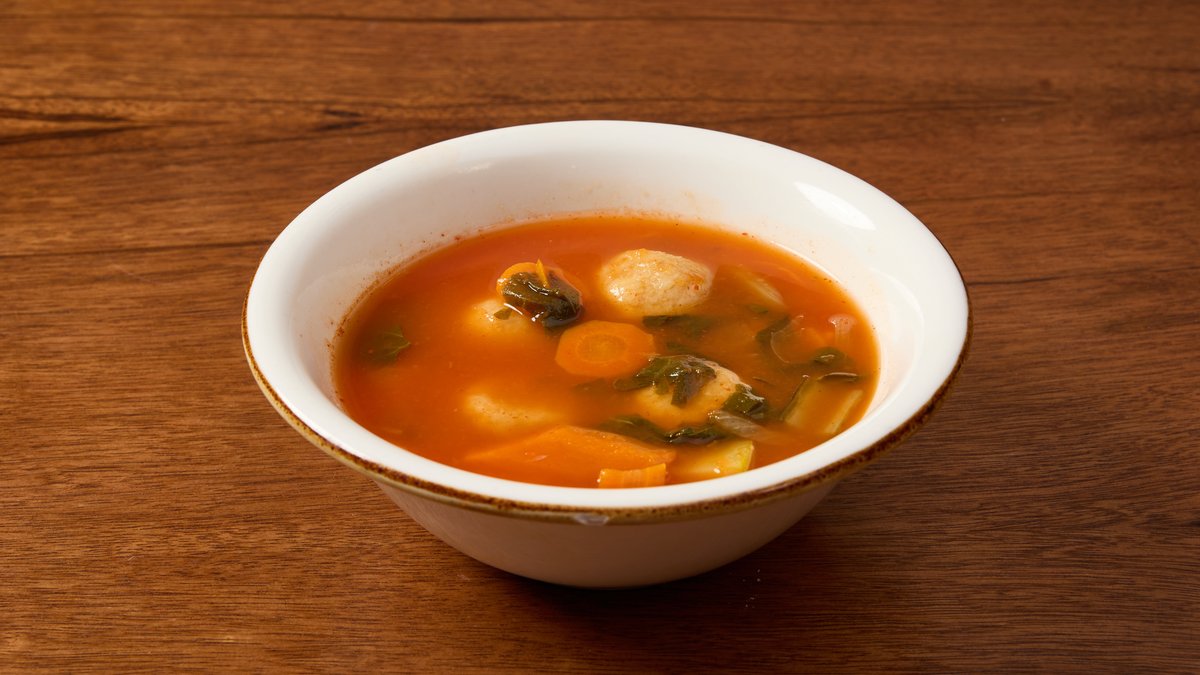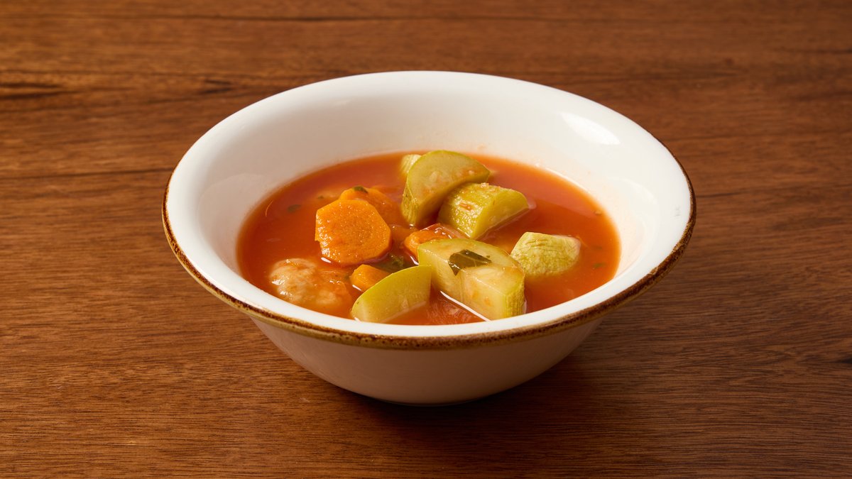 4 יח' של קובה במילוי בשר במרק עגבניות עם גזר, דלעת וקישואים
