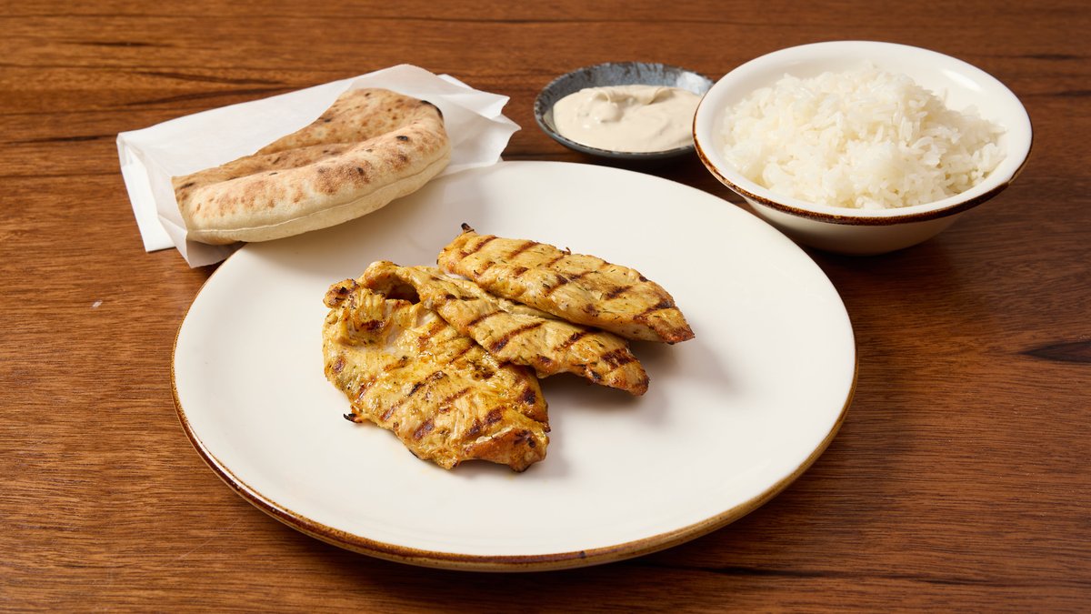 שיפודים פרגית בתבלינים, מוגשים בפיתה עם שני סלטים לבחירה בפנים