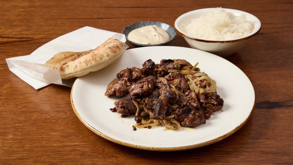 כבדי עוף צלויים עם בצל מקורמל מוגש עם תוספת צד לבחירה