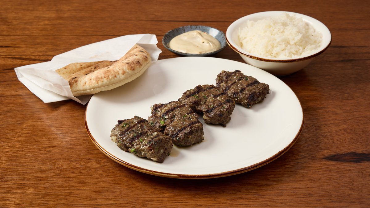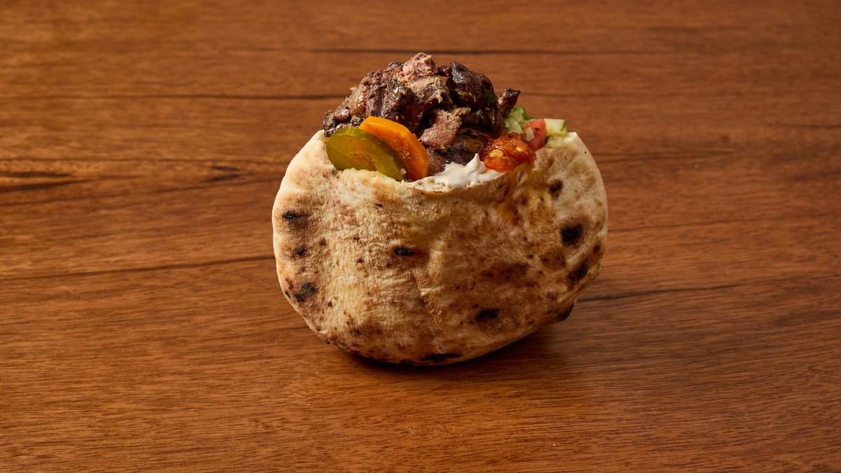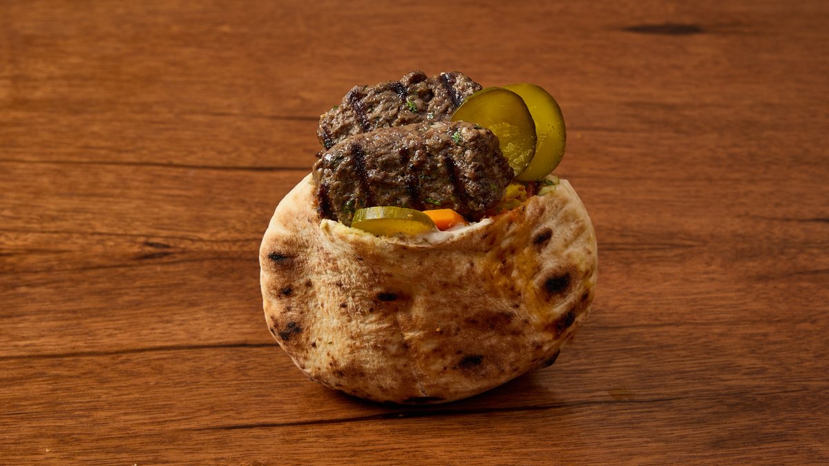 קבב בקר מוגש בפיתה, עם שני סלטים לבחירה בפנים