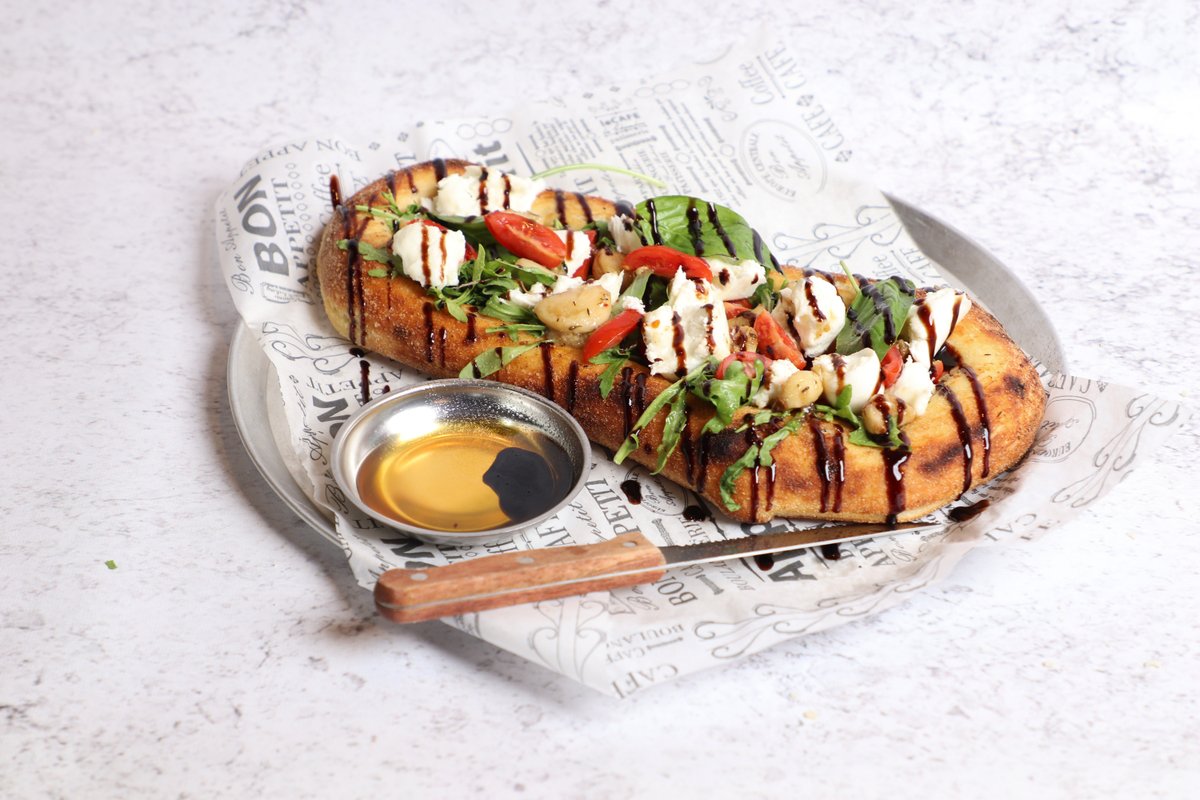 בצק פוקאצ'ה, מלח אטלנטי, מוצרלה (או פטה טבעונית), רוקט, עגבניות שרי, שום קונפי, בזיליקום ובלסמי מצומצם. המנה מוגשת לא חתוכה