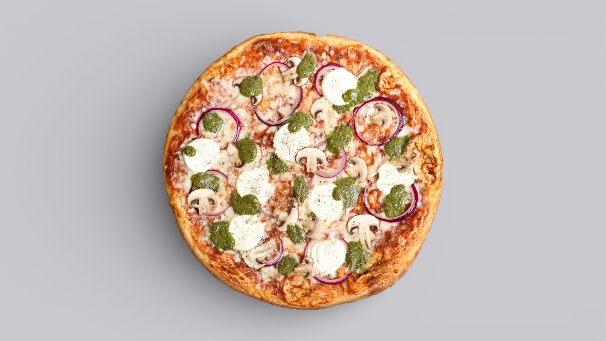 רוטב עגבניות, בצל סגול, פטריות טריות, פסטו, גבינת עיזים
